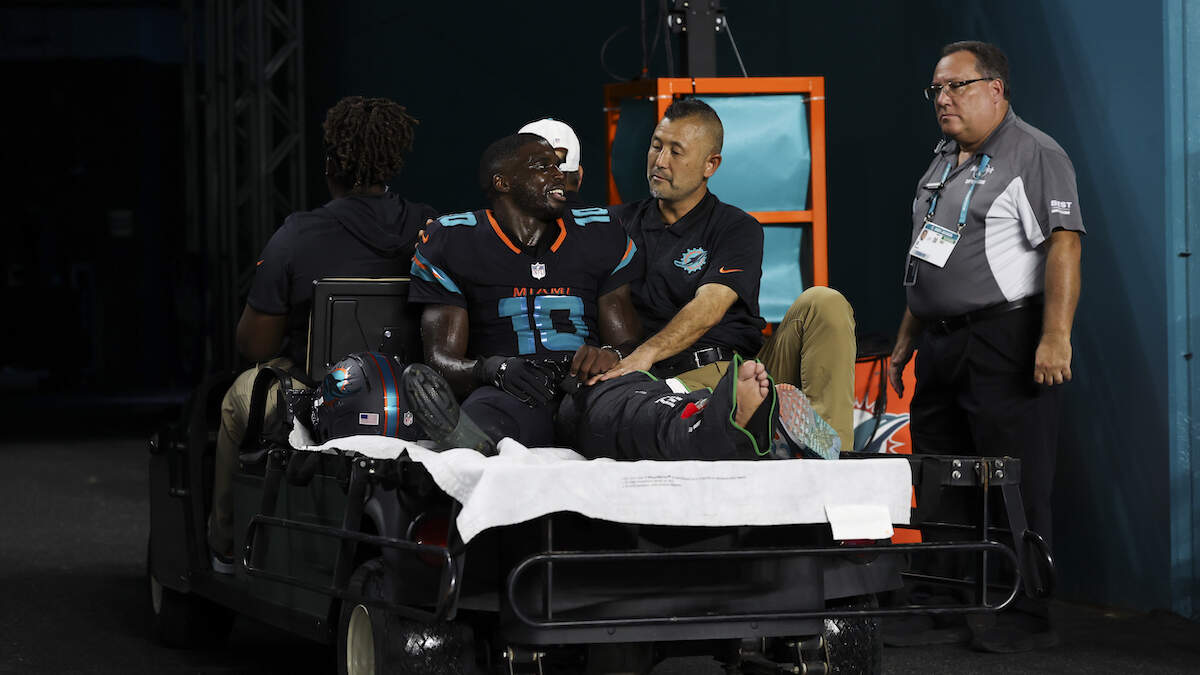 An air cast appeared to be applied to Hill's left leg while he was being tended to. The five-time All-Pro selection clapped and waved to fans as he was being taken away in the cart and received a standing ovation from the home crowd at Hard Rock Stadium.
